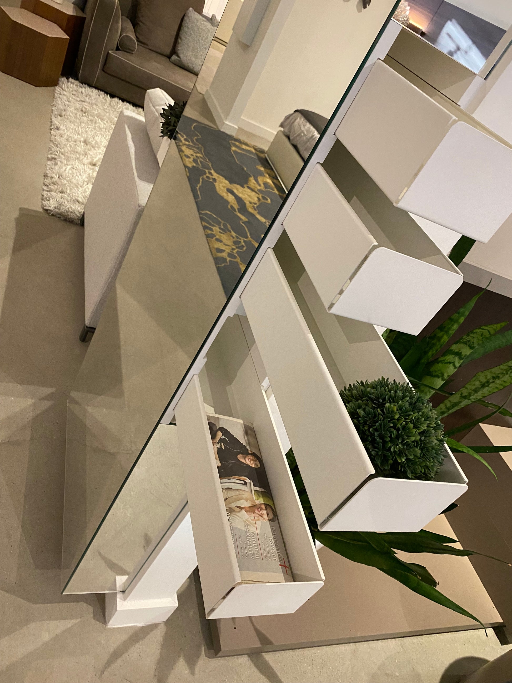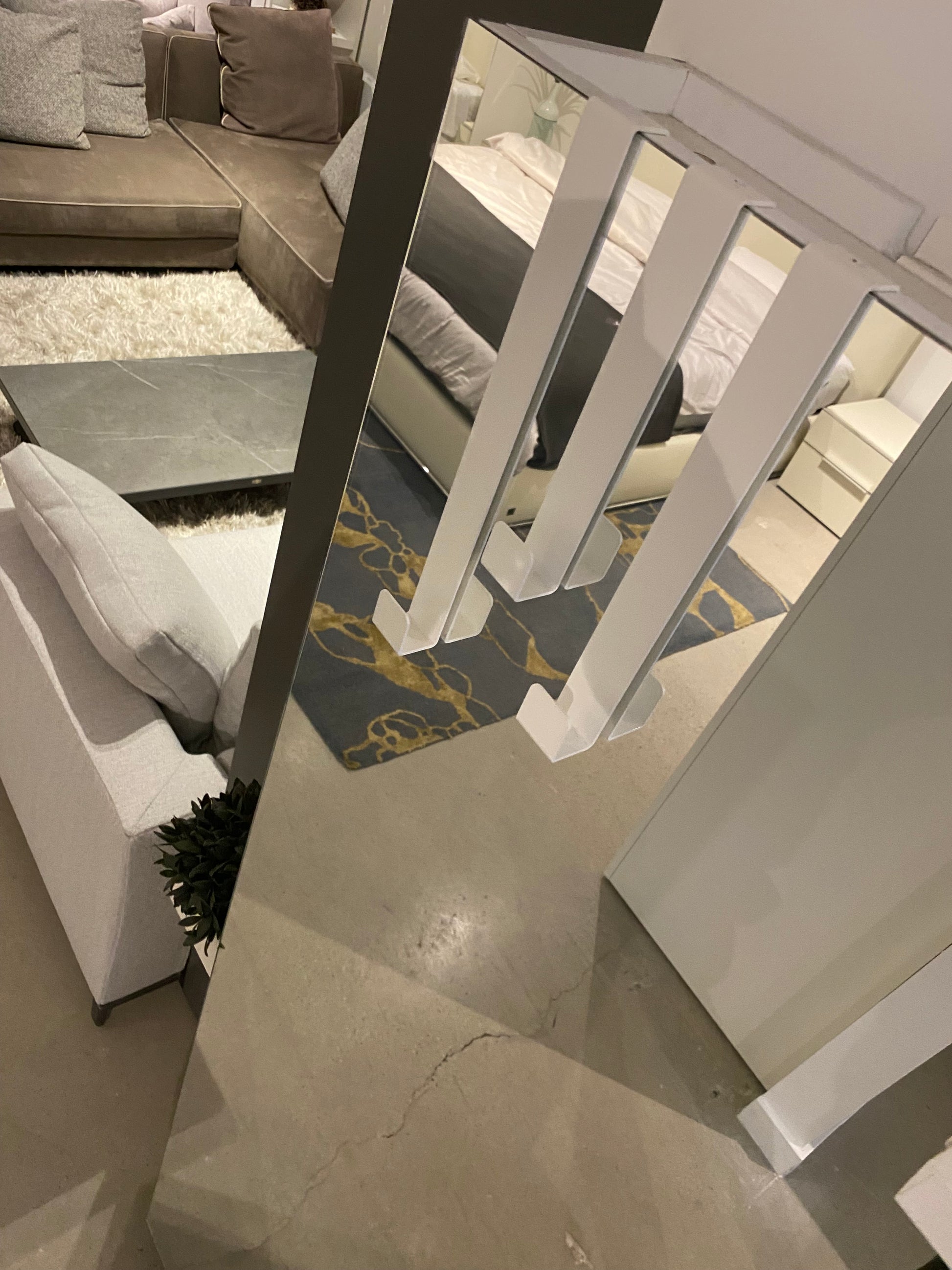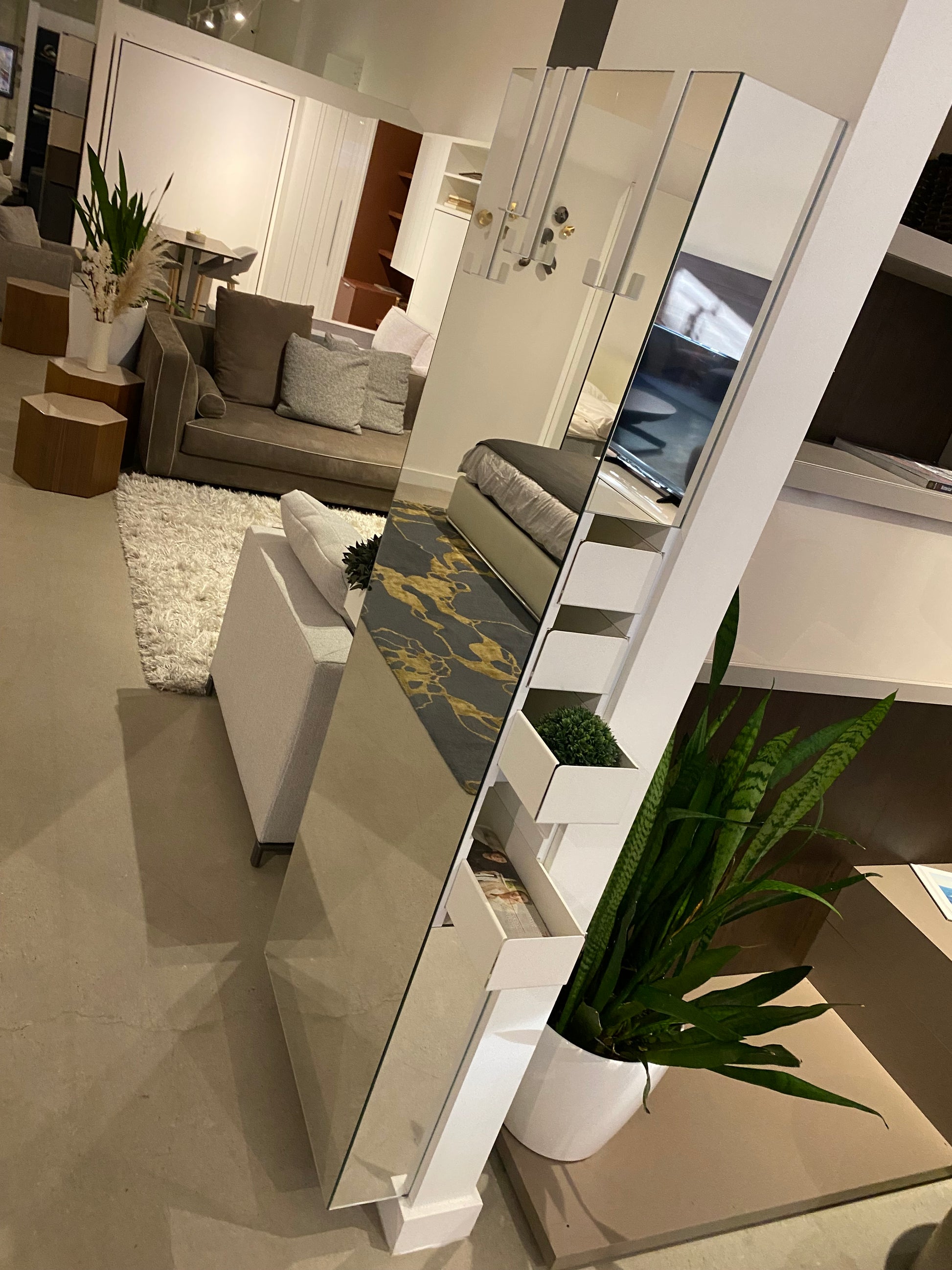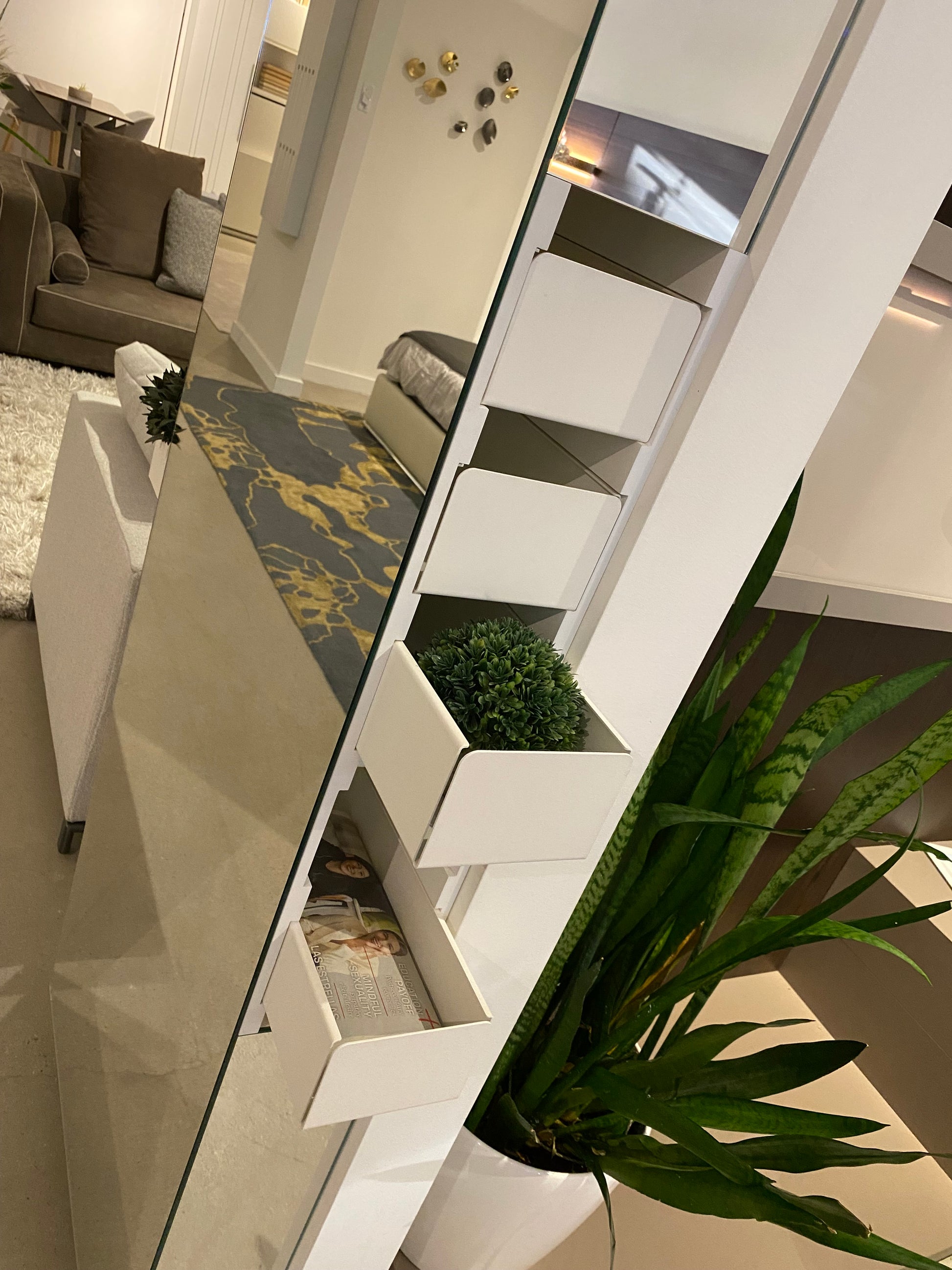 Betty is a vertically hanging mirror with retractable storage drawers and 4 hanging hooks. Perfect for entryways or bathrooms. (Floor model has a small chip on the lower corner front).