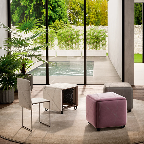 Discover the astonishing versatility of the Cubix Ottoman — an essential addition to any space, seamlessly blending innovation with functionality. Five chairs are ingeniously nested within one ottoman, four of which provide comfort with their plush upholstered backrests, and the fifth a smart stool.