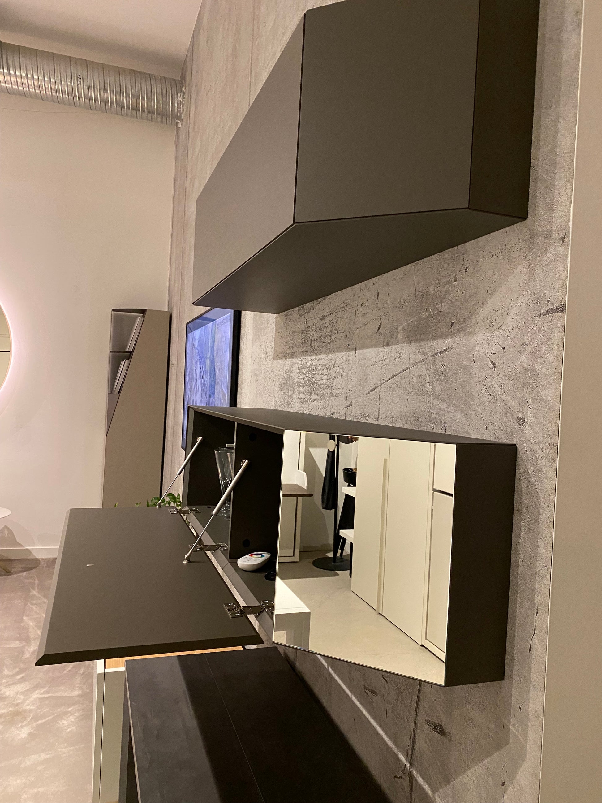 Stylish wall-mounted storage boxes with a touch-latch door and mirror feature. Sold as a set of 2.